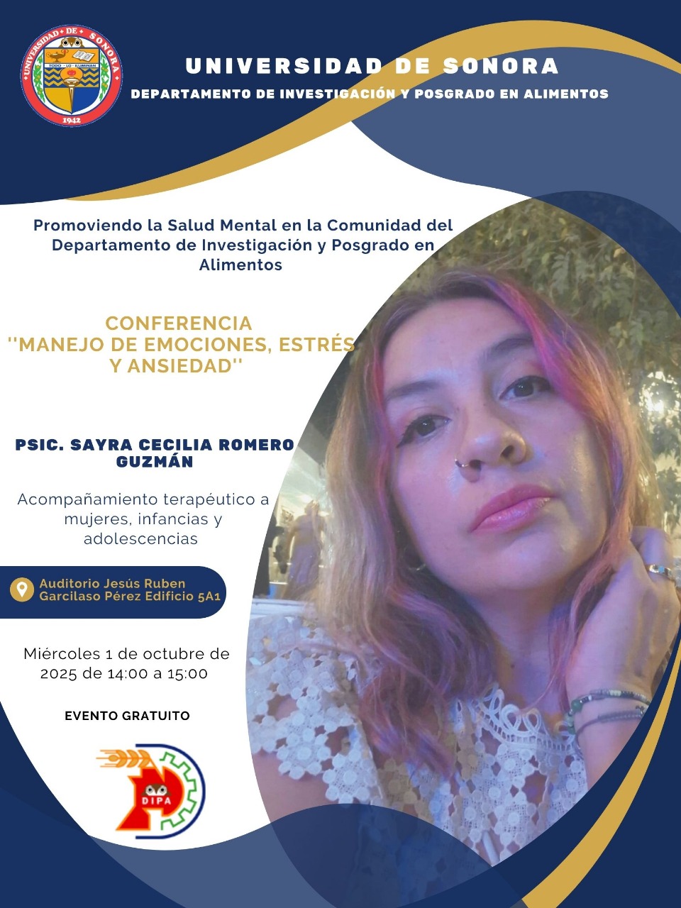 Promoviendo la salud mental en el Departamento de Investigación y Posgrado en Alimentos. Charla que impartirá la Psic. Sayra Cecilia Romero Guzmán, el día 1 de octubre de 2025, de 14 a 15 horas, en el Auditorio Rubén Garcilaso Pérez, Edificio 5A1.